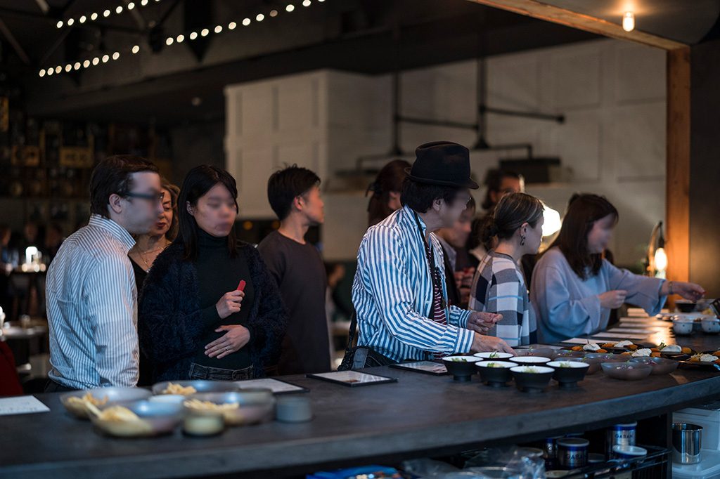 来場したゲストは新しいディッシュが並ぶと、好みのものを見つけてチケットと交換。シェフと直接話をするゲストも多く、普段のレストランでは楽しめない体験です。