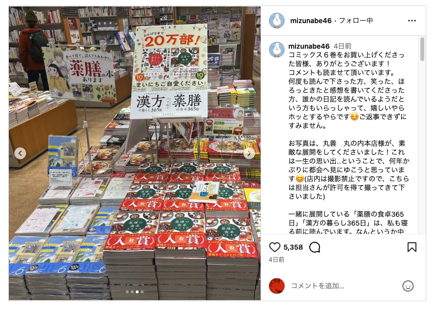 作者・水凪トリも膠原病であり、薬膳との出会いがあったことで、この作品を描くことになった。水凪トリのインスタグラムを覗くと、主人公さとこの食事か?と思わせる食卓の写真が並んでいる。《地味だけど身体においしそうな薬膳ご飯》だ。