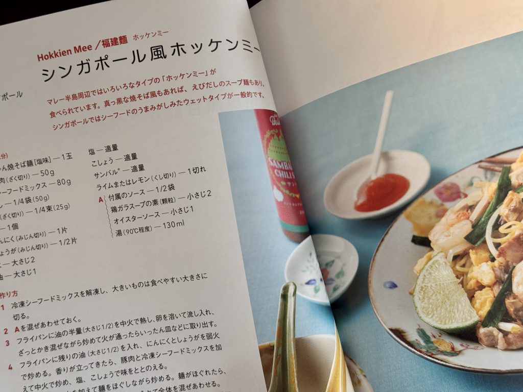 レシピにある『シンガポール風ホッケンミー』というのがある。そもそもが福建(ホッケン)省に由来する麺(ミー)という意味を持つ焼そばでマレー半島エリアではそれぞれの地域のホッケンミーがある。豚肉のうまみや海鮮だしを麺にからめながら炒めるのがシンガポール風の特徴。肉、シーフード、野菜、卵、ニンニク・生姜と鶏スープでツユだくめで食べる。